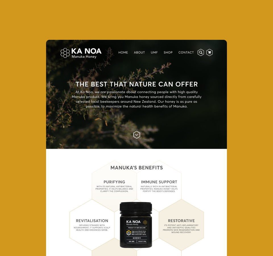 The visual identity blends elegance with authenticity, emphasizing the honey’s rare UMF grading and its unique benefits for skin health and hydration. Every design choice, from the refined packaging to the immersive digital experience, was crafted to convey Ka Noa’s commitment to quality, sustainability, and the natural power of Mānuka honey.